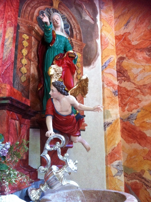 Dennoch: die Quelle und das Kirchlein sind auf jeden Fall einen Besuch wert und auch hier hatte ich das Glück, fast alleine im Raum zu sein. Mir gefiel es hier wesentlich besser als in der großen, mächtigen Basilika. Die farbenfrohen Darstellungen rundum, das Ambiente und vor allem die Ruhe abseits der Trubels spürten sich gut an.