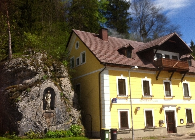 Den Gasthof zum Ursprung gibt es noch, auch die Geschichten dazu. Der Fels neben dem Gasthof, mit der Heiligenfigur drauf, wird von vielen gern als der “Ursprungsfelsen” gesehen, nur ist das ein anderer Stein. Einer, der an die überstandene Pest erinnern soll. Der heilige Ursprungsfelsen liegt dahinter, offiziell leider unerreichbar.