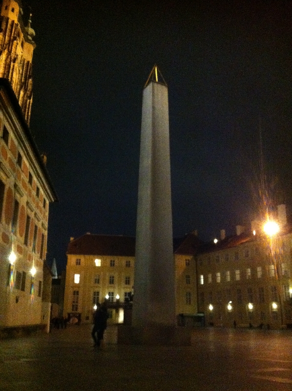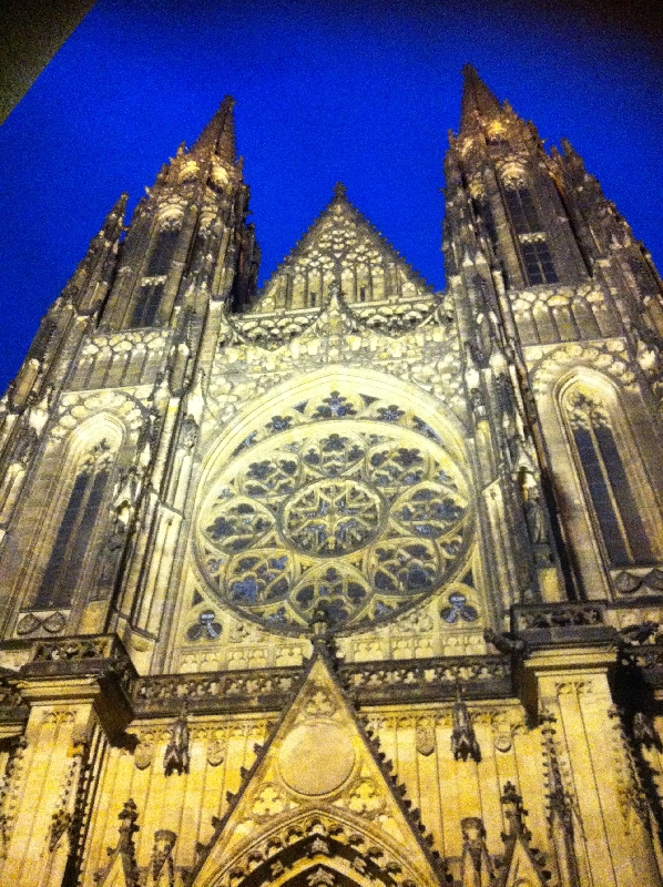 Doch zu Prag gehört auch der Veitsdom. Wer hier war und den nicht gesehen hat, dem fehlt was und darum stand dieser uralte Kultplatz auch auf meiner “Must see”-Liste. Die erste Begegnung mit diesem ganz besonderen geomantischen Bauwerk hatte ich gleichfalls am Abend, als es schon dunkel war. Die Kirche war natürlich geschlossen, aber der Platz rundum war angenehm leer und so konnten wir uns dieses Bauwerk in aller Ruhe von außen ansehen. Der erste Eindruck, wenn man unter dem Torbogen unmittelbar vor dem Dom steht, ist einfach überwältigend. So groß … der Veitsdom sprengt fast den Platz.